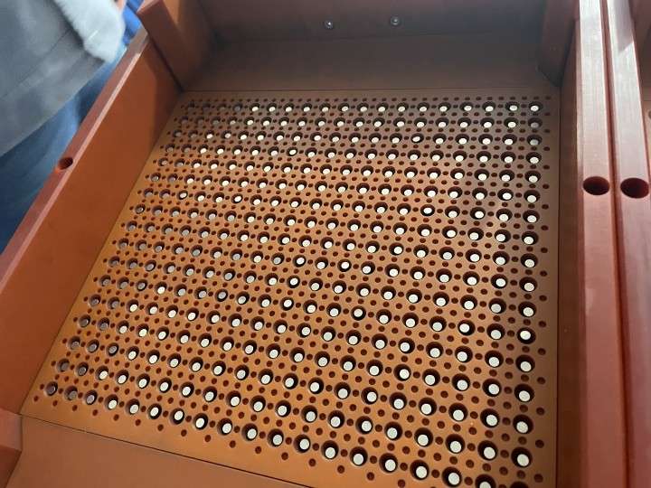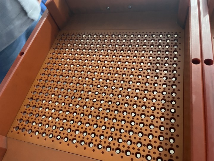 我們將零件倒入我們料槽中,一鍵啟動(dòng),自由人整列機(jī)開始作業(yè),通過(guò)振動(dòng)將我們零件落入治具板中,48S就可完成排列,設(shè)備停止作業(yè)后,打開卡鉗,取出治具板,可以進(jìn)行下一步工藝。