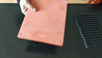 如圖所示:定位好吹塑盤與翻轉(zhuǎn)板后,進(jìn)行與示例三一樣的步驟,雙手壓緊吹塑盤與翻轉(zhuǎn)板進(jìn)行180°翻轉(zhuǎn),翻轉(zhuǎn)完成后,取下翻轉(zhuǎn)板,這樣五金小零件就全部包裝到吸塑盤里啦!