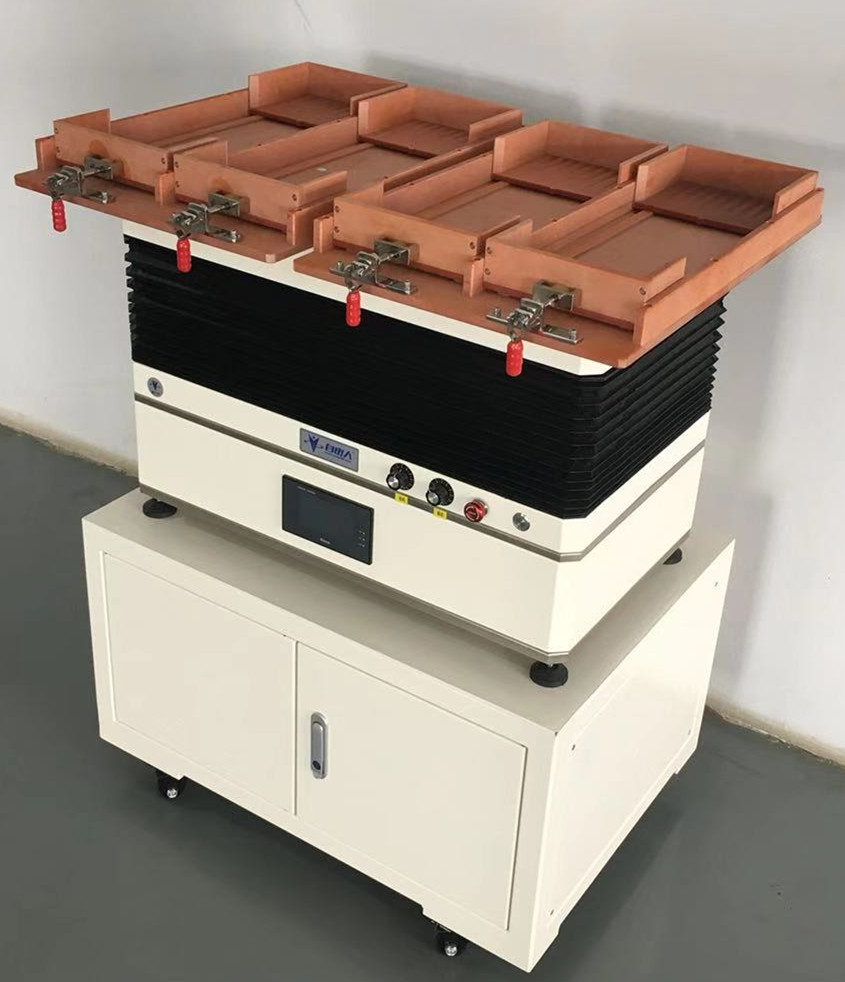 通過主機的前后振動和左右擺動,使這些不規(guī)則的小銅片按照設(shè)定好的方向和正反面,排列在設(shè)計好的治具板中。