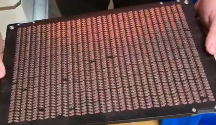 大約150秒,完成了不規(guī)則小銅片的排列,1版治具板大約有1280左右的小銅片,效率達(dá)到了99%以上。1臺自由人排列機可以同時整列4塊治具板,大大提高了工作效率,1臺自由人排列機頂5個操作工。