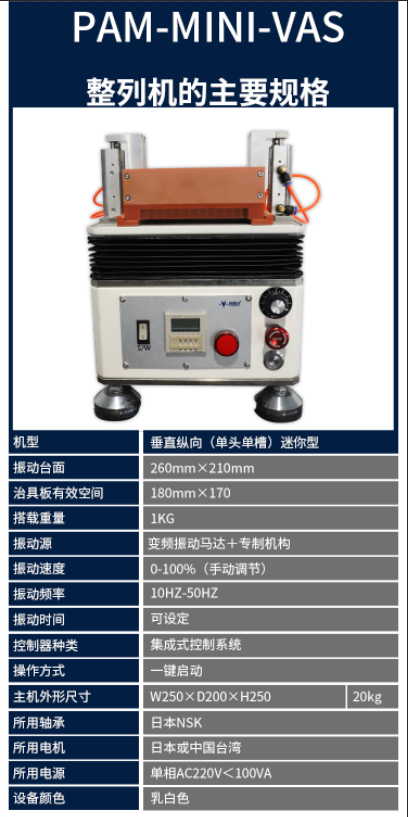 1. PAM-MINI-VAS整列機(jī)采用日本原裝軸承,3年免維護(hù),確保使用壽命!中國(guó)臺(tái)灣電機(jī)或日本電機(jī),保證設(shè)備品質(zhì),減少故障率。