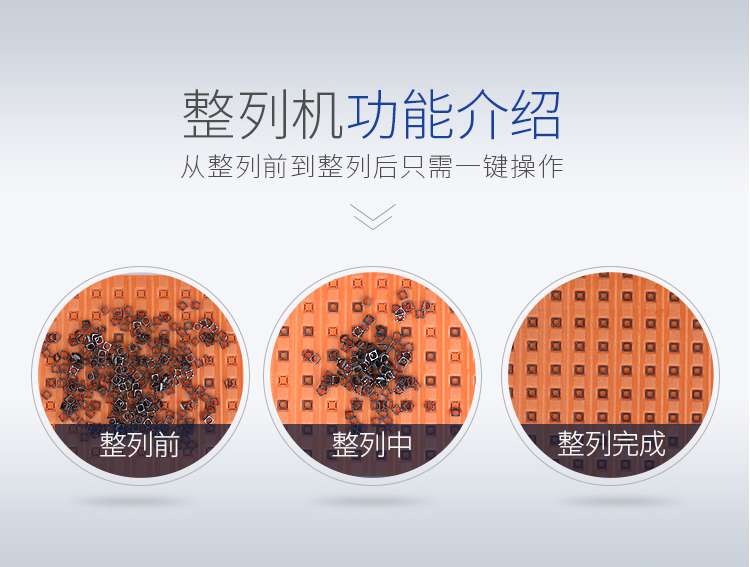 首先,我們把需要整列的手機零件倒入整列機的料槽中,啟動按鈕,通過整列機的前后振動和左右擺動把產(chǎn)品整列到治具板中。這樣手機零件就被整列完成了,完成之后的手機零件可以進行下一步的工藝。大大的節(jié)約了時間,提高了生產(chǎn)效率。
