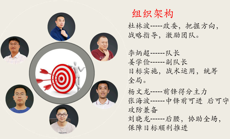 為了保證順利達成目標,配合銷售隊,研發(fā)隊制定一套別具一格組織架構(gòu),正副隊長各一名,政委一名,前鋒一名,中鋒一名,后衛(wèi)一名,大家各司其職,協(xié)同作戰(zhàn)