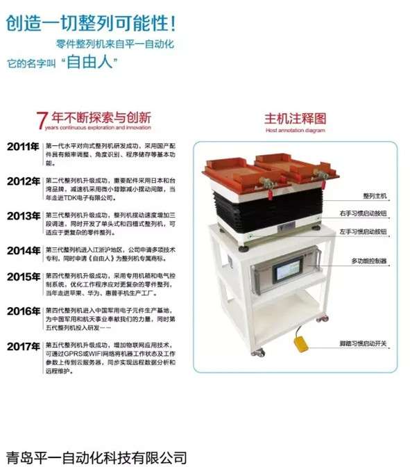 從2013到2018年平一自動化專注零件整列領(lǐng)域研發(fā),為用戶提供全套供料系統(tǒng)的解決方案,已成功進入蘋果、華為、榮耀、三星、富士康、TDK等眾多知名品牌的精密零件供應鏈。