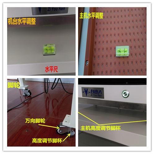 5 使用自備或附帶的水平尺調(diào)整踢腳,使整列機(jī)機(jī)臺和主機(jī)水平,調(diào)整完成后鎖緊踢腳螺絲