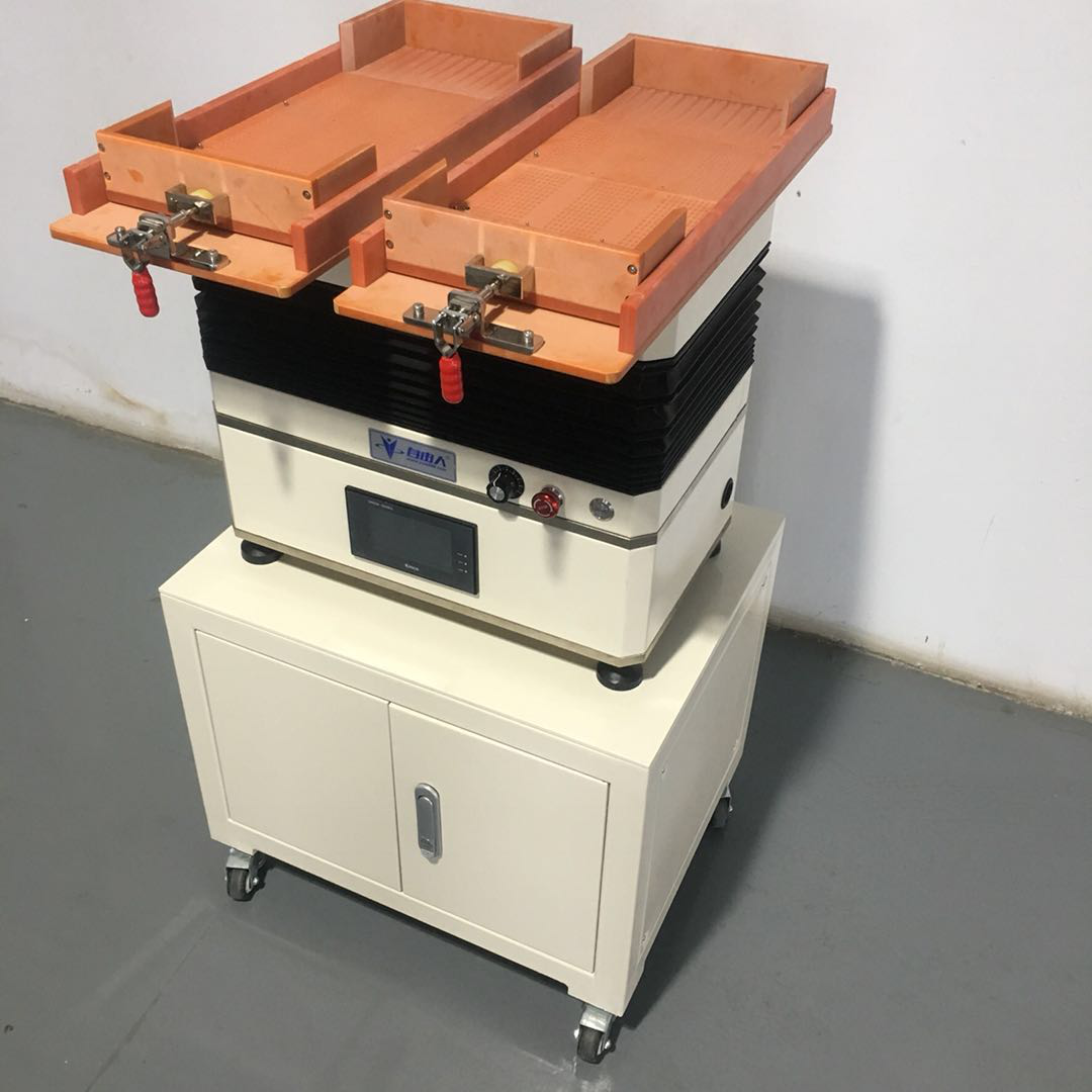 第一步將手機(jī)聽筒濾網(wǎng)薄片倒入自由人PAMII-STW-E標(biāo)準(zhǔn)型振料機(jī)料槽內(nèi),通過主機(jī)的前后振動(dòng)和左右擺動(dòng),把手機(jī)濾網(wǎng)薄片整齊的排列在設(shè)計(jì)好的治具板中。