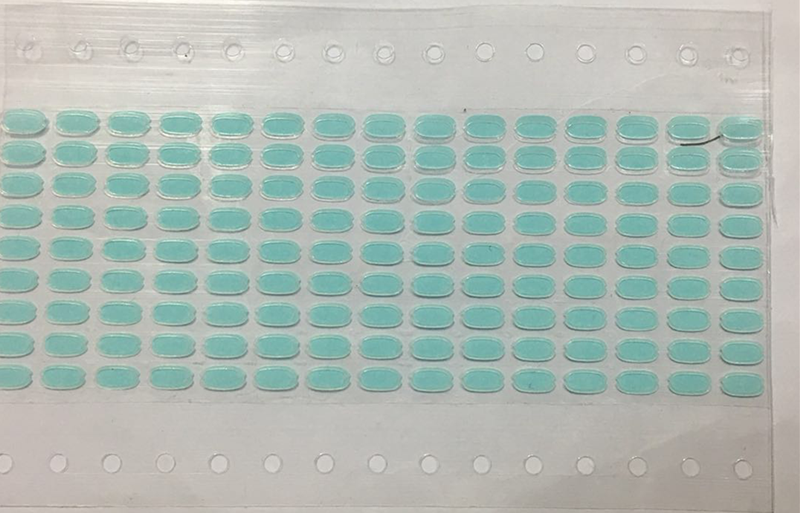 第三步,將膠帶貼粘貼在翻轉(zhuǎn)板上,取下膠帶貼,這樣就把手機(jī)濾網(wǎng)薄片整列粘貼好了。